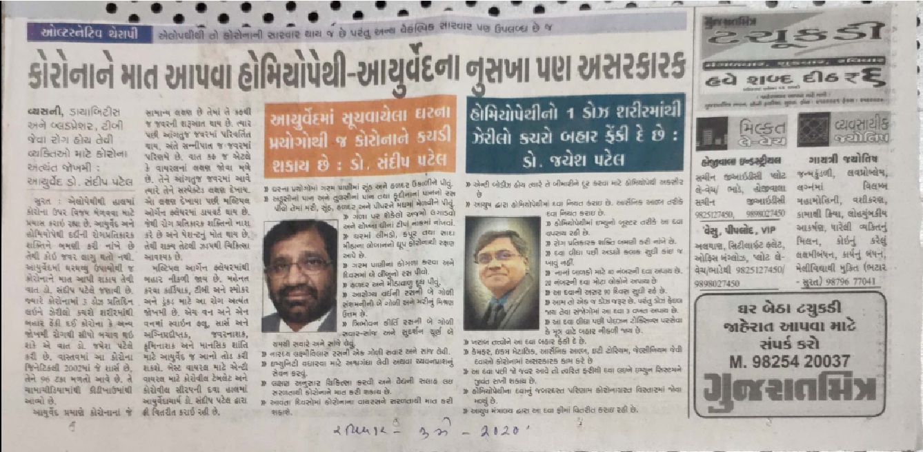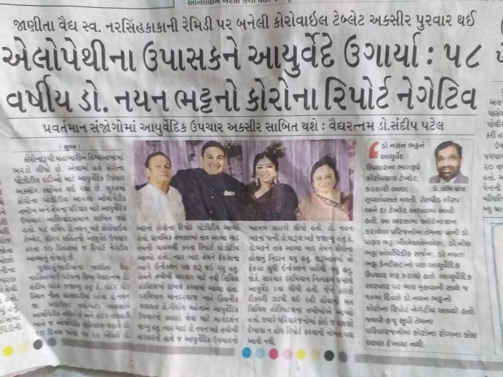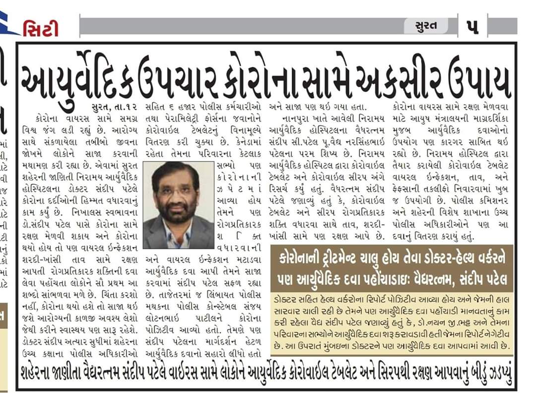 Janadesh News appreciated Vaidhyaratnam Sandip Patel and team of Niramay Ayurvedic Hospital for their excellent service in Covid 19 pandemic. This news also covers some important facts, do’s and don’ts and home remedies and medication about Covid 19. To know more, please view news.